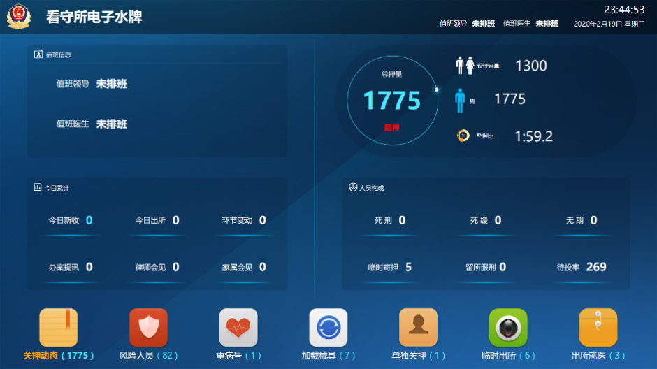 產(chǎn)品介紹:監(jiān)所電子水牌系統(tǒng)基于公安智慧監(jiān)所實戰(zhàn)平臺, 從中提取相關(guān)數(shù)據(jù),以電子屏顯示的方式實現(xiàn)值班室 對重點人員、違規(guī)人員等重要被監(jiān)管人員情況的掌 握,值班室民警通過直接操作屏幕,可直觀的了解監(jiān) 所被監(jiān)管人員的近期動態(tài)信息,解決監(jiān)所重點管控人 員信息更新不及時、信息量少等問題,實現(xiàn)高效管理、 實時跟蹤、重點關(guān)注。